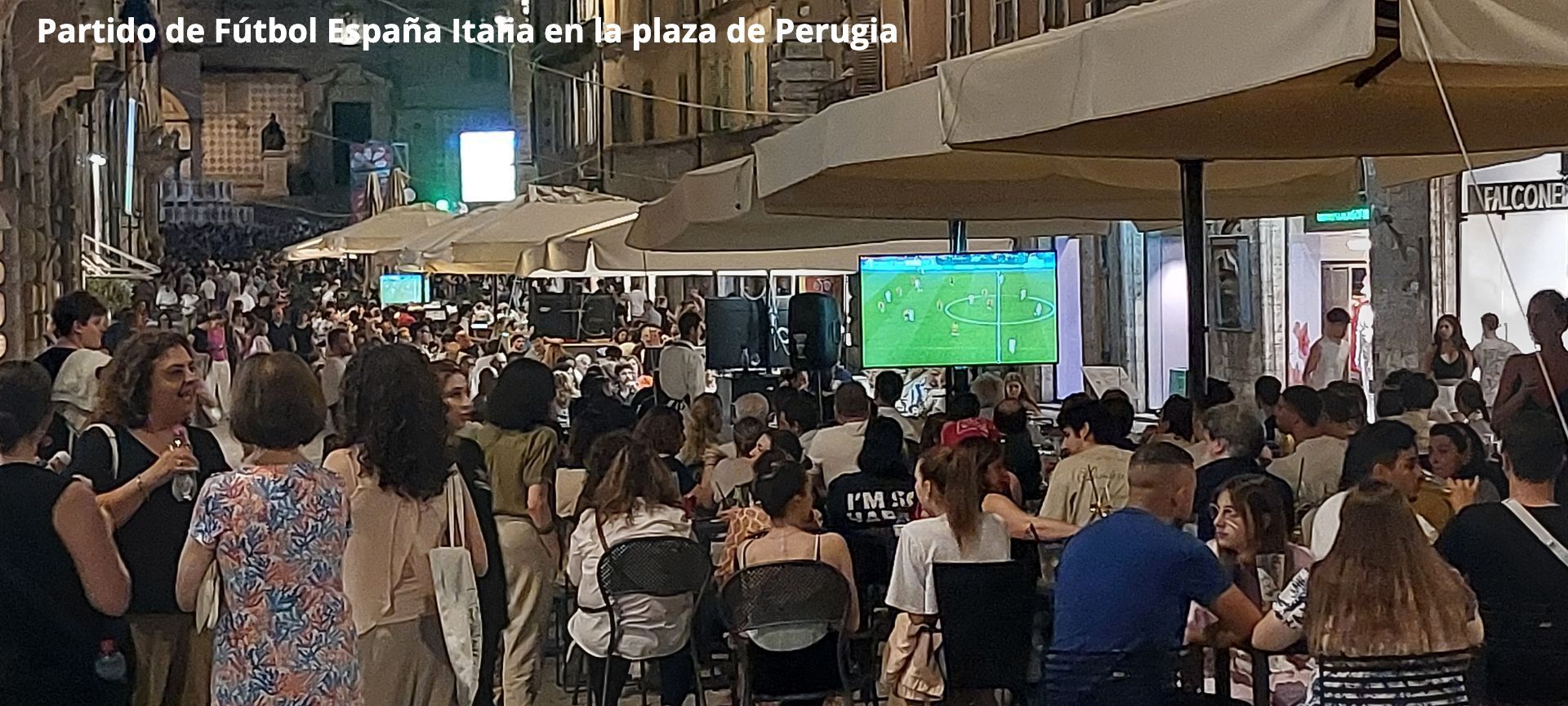 Perugia, al menos por aquellas fechas de finales de junio, ofrecía la sensación de ciudad agradablemente concurrida sin agobios y presiones propias del turismo de masas. El día veinte se celebraba un partido de fútbol de la Eurocopa 2024 entre Italia y España. Al efecto, además de las terrazas de los bares que exhibían sus televisores de pantalla gigante se había dispuesto una gran pantalla en la plaza IV de Noviembre, al lado de la fontana Maggiore y con telón de fondo de la catedral, y con una larga barra para servir bebidas a los espectadores. No somos muy de fútbol, especialmente yo, pero no pudimos sustraernos a disfrutar de una parte en la calle, viendo sufrir a los italianos por la derrota que infligió una superior selección española a juicio de la mayoría de los espectadores, tal vez no de los tifosi más recalcitrantes.